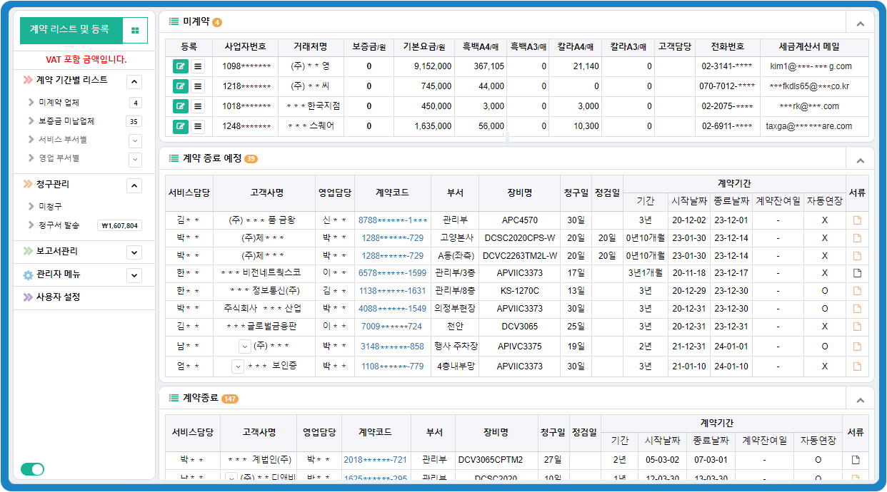 거래처 관리, 서비스 관리, 장비 관리, 소모품 관리 현황과 양식을 한 곳에서 확인할 수 있으며 엑셀 다운로드 기록을 알 수 있습니다.